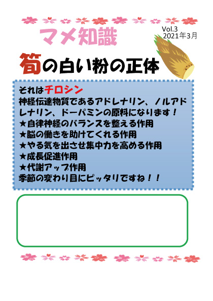 筍に付着している白い粉、なんだかわかりますか?それは「チロシン」というものです。神経伝達物質であるアドレナリン、ノルアドレナリン、ドーパミンの原料になります。