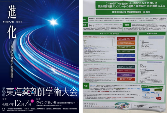 私たちは、生成AIを活用した薬局業務支援に関するポスター発表を行いました。「ChatGPT と Gemini を併用した業務支援テンプレートの構築」をテーマに、複数のAIを使い分ける設計や、実務での安全な活用に向けた考え方について報告し、参加者の皆様と活発な意見交換を行いました。